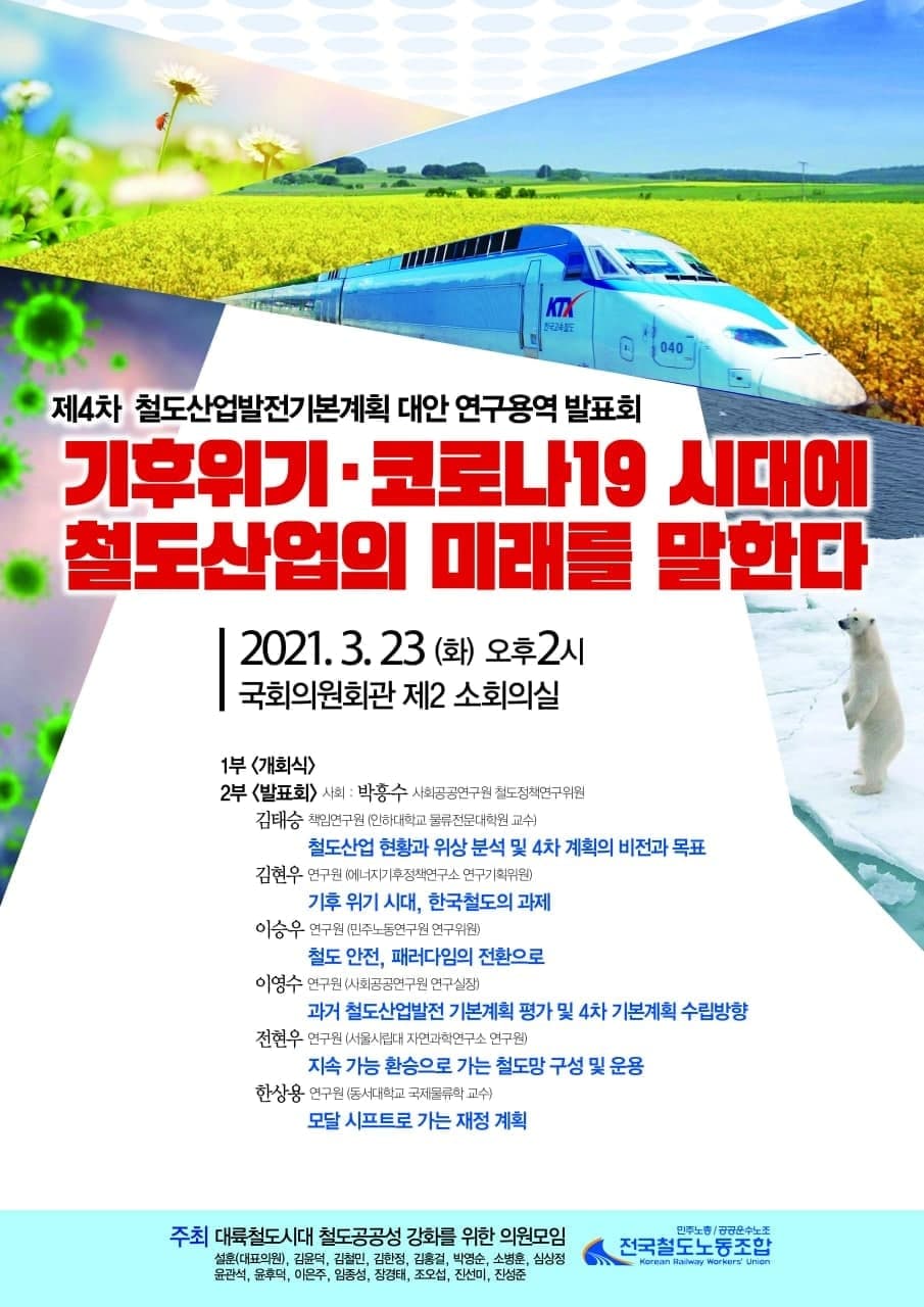 제4차 철도산업발전 기본계획은 달라야 합니다. 철도산업은 공공성을 기본으로 발전해야 합니다. "기후위기·코로나19 시대에 철도산업의 미래를 말한다 – 제4차 철도산업발전기본계획 대안 연구용역 발표회”는 근 1년에 걸친 연구의 결과를 발표하는 소중한 자리입니다. 이 자리는 철도산업발전 기본계획에 대한 구체적 대안을 적극적으로 제시하고 있다는 점에서 큰 의미를 갖는다고 생각합니다. 본 연구발표회를 통해 한국 철도의 발전에 대한 사회적 논의가 확대되었길 바랍니다.