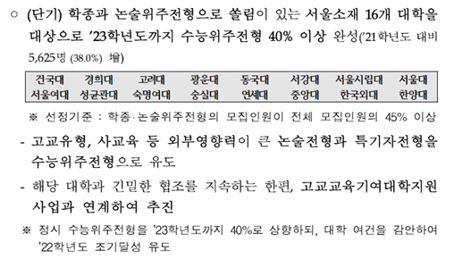 정의당 이은주 의원이 받은 교육부와 한국대학교육협의회 자료 등을 보면, 정부가 정시 확대하려고 콕 짚은 서울 16개 대학의 경우 수능 전형이 11.4% 포인트, 학생부교과가 3.3% 포인트 증가했다. 반면 학생부종합은 11.8% 포인트 감소했다. 논술과 실기도 각각 2.5% 포인트와 0.6% 포인트 감소했다.
