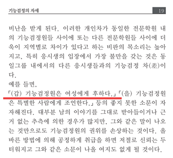 <기능검정지침서>에는 운전면허 실기시험을 채점하는 기능검정원이 공정성과 신뢰성을 갖추지 못하면 “기능검정원은 여성에게 후하다”는 “좋지 않은 소문이 자자해질 것”이라는 예시가 제시된다. <그림3> 또, 검정원이 시험 응시생을 대상으로 객관적인 평가를 해야 함을 강조하며 “자기 마누라한테 받은 분풀이를 회사에 와서 부하 직원에게 푸는 것처럼” 응시생을 대상으로 분노를 해소하려는 심리를 조심하라고 소개한다. <그림4>
