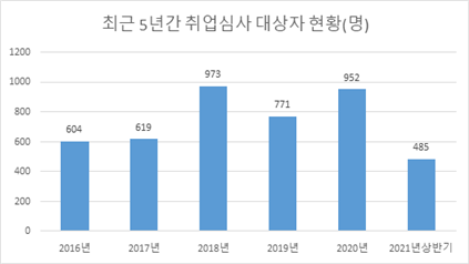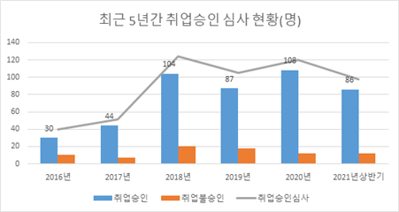 같은 기간 취업승인 심사 대상자는 40명에서 120명으로 200% 증가했고 취업승인은 30건에서 108건으로 260%나 증가했다. 반면 불승인 건수는 2018년 20건, 2019년 18건을 제외하면 기간 내내 평균 10여 건에 불과했다.