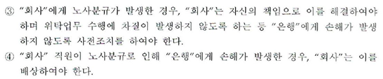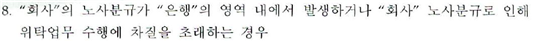 IBK기업은행은 또 제25조 1항 8호에는 ‘회사의 노사분규가 은행의 영역 내에서 발생하거나 회사 노사분규로 인해 위탁업무 수행에 차질을 초래하는 경우’라는 내용을 담았다. 헌법이 보장한 노동자의 단체행동권을 계약해지의 사유로 본 것이다.