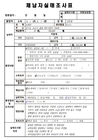 경기도는 공무원 인력 부족으로 지방세 소액체납자에 대한 징수 활동이 어려워지자, 2019년 모든 시군을 대상으로 체납관리단 사업을 시행했다. 체납관리단은 체납자 실태조사 목적으로 채용됐으며 계약 기간이 3개월, 6개월 등 1년 미만인 단기 근로자이다. 체납관리단은 크게 전화 상담원과 실태조사원으로 나뉜다. 전화 상담원이 납세자의 주소와 체납세액, 체납처분 현황 등 기초정보를 작성하면 이를 바탕으로 실태조사원이 체납자의 집을 방문해 실태조사표<그림1>를 작성하는 방식이다. 정의당 이은주 의원실(행정안전위원회)이 파악한 결과, 실태조사표에는 실태조사원이 체납자의 소득 유무 및 재산 사항을 파악하고 납세 예정일을 약속받아 기재하게 되어있었다. 사실상 경기도가 세무 공무원의 권한을 공공근로자들에게 일부 이양한 것이다.