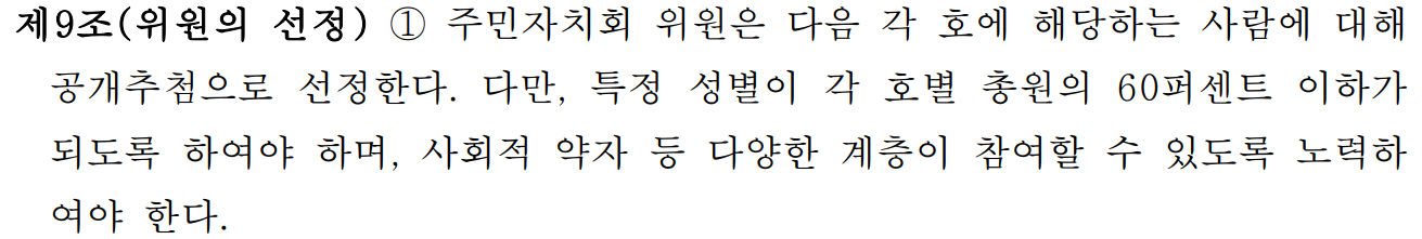 남성의 사회활동 비중이 높은 지역의 사회·문화적 특성상 여성 지원자가 상대적으로 적었기 때문이라는 것이 담당자 설명이다. 주민자치회가 주민 스스로 지역에 필요한 서비스를 결정하고 해결해 나간다는 취지대로 운영되기 위해서는 대표성을 지닌 주민들의 동등한 참여가 필수적이다. 성별 격차를 줄이기 위한 노력이 필요하다. 조례 내용이 강제가 아닌 권고 사항이라는 것 역시 일부 지역의 성별 격차를 낳은 원인으로 지목된다. 의무화를 검토할 필요가 있다.