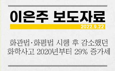 이은주 의원은 “법 시행 4년만에 절반으로 줄어든 화학사고가 다시 증가하기 시작한 시기를 눈 여겨 봐야 한다”며 “시설노후화 문제와 더불어, 2019년 일본의 반도체 핵심 소재 3종 수출 규제 조치와 2020년 코로나 사태를 계기로 재계의 화학물질 규제 완화 요구를 받아들인 정부가 대폭적인 화학물질 규제완화 조치를 한 시기와 맞물린다”고 지적했다.