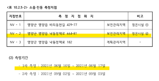 평가준비서에 따르면 사업주는 2021년 6월16~17일 사업예정지 3곳(NV-1, NV-2, NV-3)에서 소음·진동을 측정했다. <표1 참조>