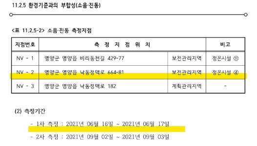 이 중 NV-2 지점의 주소가 평가준비서에선 ‘영양군 영양읍 낙동정맥로 664-59’였는데, 초안과 본안에서는 664-81로 변경돼 있다. <표2 참조>