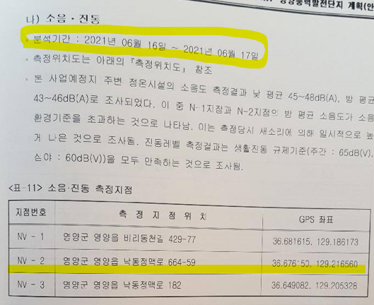 정의당 이은주 의원(환경노동위원회)이 AWP 영양풍력발전단지 전략환경영향평가서 평가준비서와 초안 및 본안을 비교해 본 결과 2021년 6월16~17일 진행된 소음·진동 측정지점의 주소가 달라진 사실을 확인했다.
