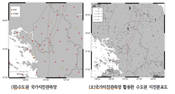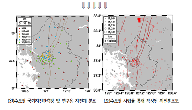수도권도 마찬가지다. 같은 기간 수도권에 연구용 지진계 60개소를 추가 설치해 운영한 결과, 기상청 공식 발표(2회) 대비 무려 18배 이상 많은 미소지진(37회)이 관측됐다. 수도권에서 발생하는 지진 규모는 대체로 규모 2.0미만이며, 깊이는 4~15km이내에서 분포하는 것으로 나타났다.