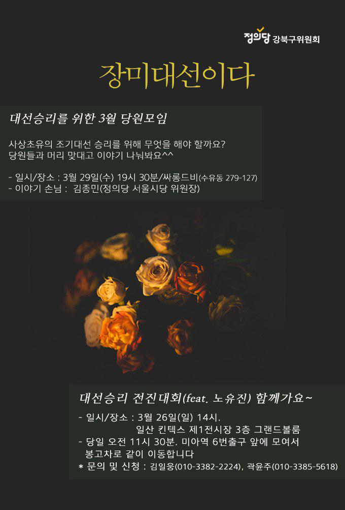 - 일시/장소 : 3월 26일(일) 14시. 일산 킨텍스 제1전시장 3층 그랜드볼룸 - 당일 오전 11시 30분. 미아역 6번출구 앞에 모여서 봉고차로 같이 이동합니다 * 문의 및 신청 : 김일웅(010-3382-2224) 곽윤주(010-3385-5618) 대선 승리를 위한 3월 당원모임 - 일시/장소 : 3월 29일(수) 19시 30분. 싸롱드비(수유동 279-127) - 이야기 손님 : 김종민(정의당 서울시당 위원장) |