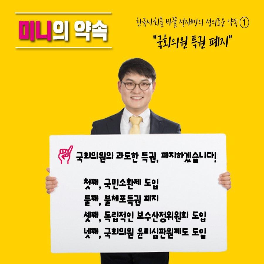 한국사회를 바꿀 정재민의 정의로운 약속 ① 대한민국 적폐 끝판왕, 국회의원들의 각종 민폐 특권들을 과감히 분리수거하겠습니다! 한국사회의 민의를 대변하는 국회에서 국회의원들의 역할은 매우 중요합니다. 국민