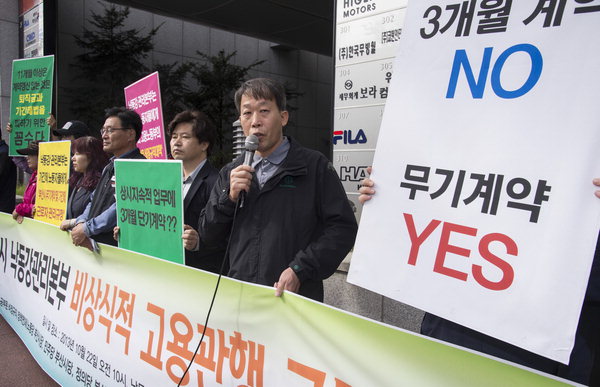 부산지역 공공부문 비정규직 정책연대(이하 정책연대)는 22일 부산 사상구 낙동강관리본부 앞에서 기자회견을 갖고 비정규직 근로자의 무기계약을 회피하는 낙동강관리본부의 고용관행을 규탄했다. 정책연대는 "낙동강 주변 생태공원을 정비하는 일은 상시 지속적인 업무인데도 2, 3, 4개월 단위로 계약을 반복 갱신하다가 총 11개월이 되면 근로계약을 해지하고 있다"고 주장했다. 이어 정책연대는 ▷정부의 공공부문 비정규직 대책 적용 ▷부산시 무기계약 및 기간제 근로자 관리 규정 준수 ▷3개월 단기계약 중단과 무기계약 전환 등을 요구했다.