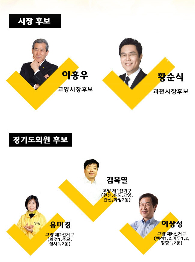 정의당 경기도당 6.4지방선거 공직후보자는 ▲시장후보 △이홍우 고양시장 후보 △황순식 과천시장 후보 ▲경기도의원 후보 △유미경(고양 제2선거구) 후보 △김복열(고양 제1선거구) 후보 △이상성(고양 제6선거구) 후보 ▲기초의원(시의원) 후보 △구자호(부천 차선거구) 후보 △김인숙(부천 바선거구) 후보 △김종한(의정부 다선거구) 후보 △김혜련(고양 나선거구) 후보 △문현수(광명 나선거구) 후보 △박시동(고양 가선거구) 후보 △박정원(과천 가선거구) 후보 △배준호(성남 카선거구) 후보 △손정욱(안양 사선거구) 후보 △송유옥(고양 카선거구) 후보 △이재용(안산 마선거구) 후보 △이종명(의왕 나선거구) 후보 △임승태(고양 바선거구) 후보 △정동재(고양 다선거구) 후보 △한기석(시흥 가선거구) 후보 등 총 20명이다.